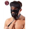 Zwart hoofdmasker met een afneembare ball gag. Het masker is weer verbonden aan de halsband d.m.v. 3 korte kettingen. Aan de halsband zit een langere kettingen met een imitatie leren bad.
